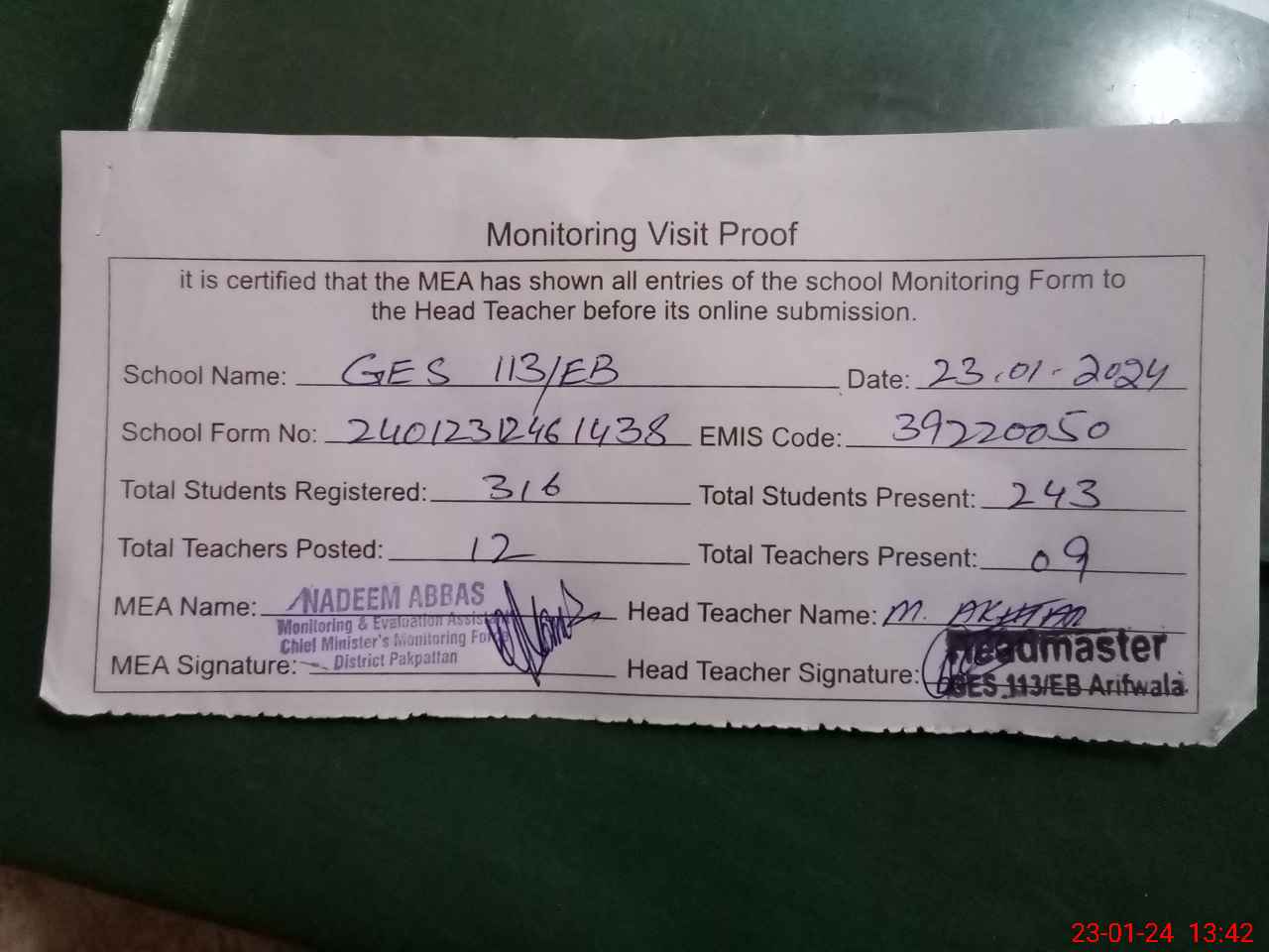 | EMIS Code: 39220050 | Name of School: GES 113 EB P/O 111 EB ARIFWALA | |||