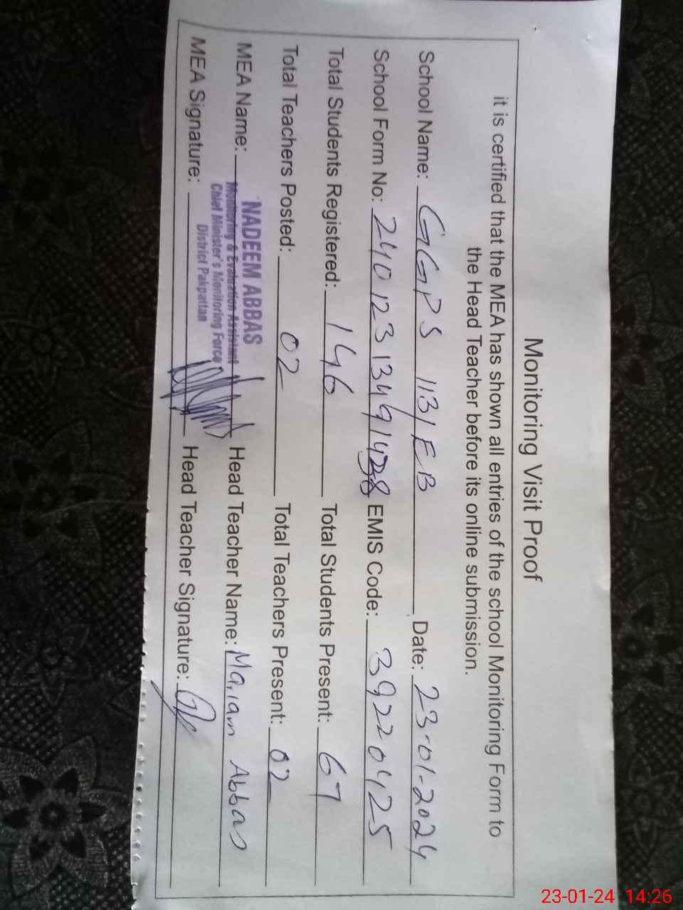 | Attendance Register | Head Teacher | MEA with School | Visit Proof |