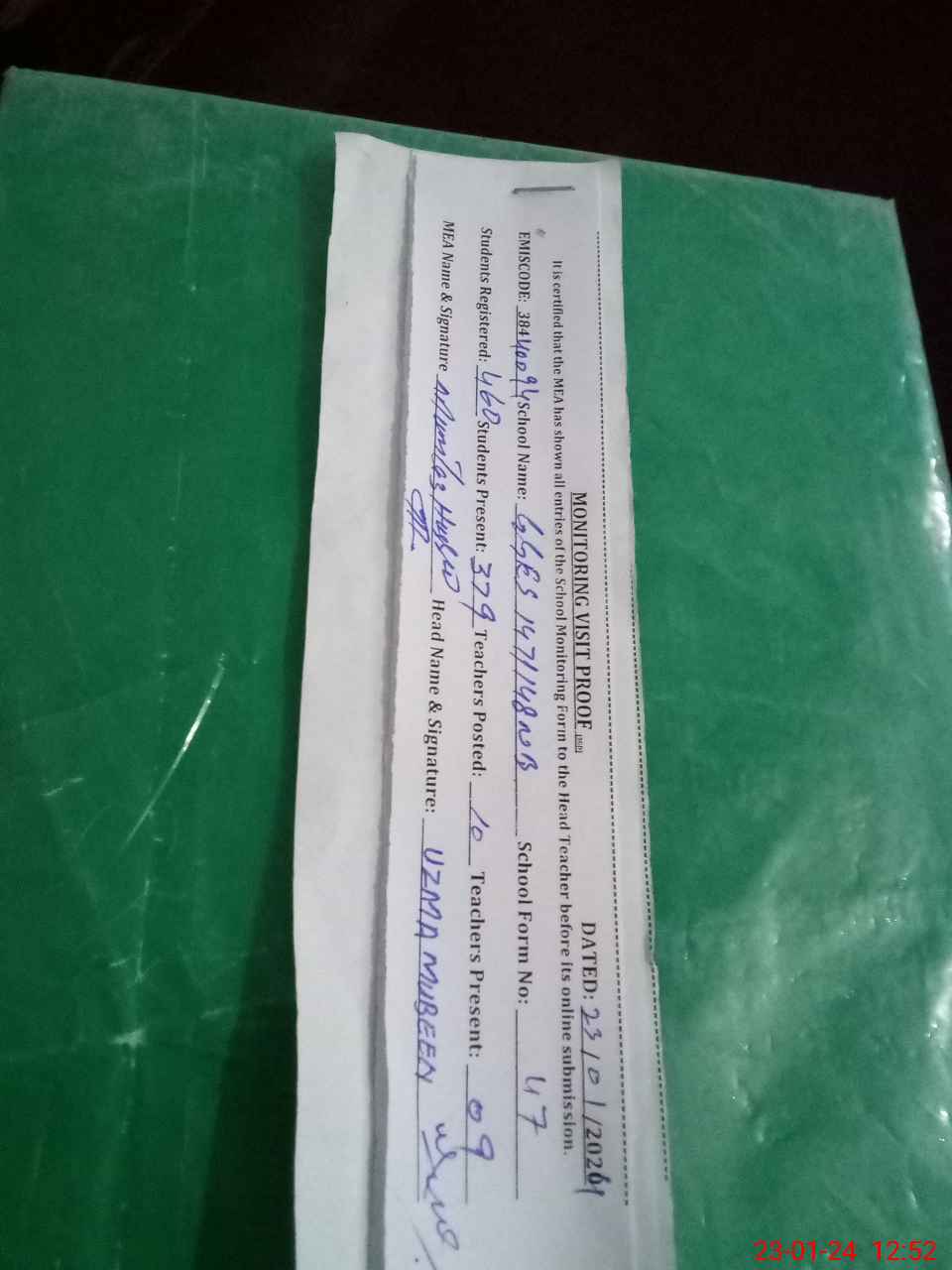 | Attendance Register | Head Teacher | MEA with School | Visit Proof |