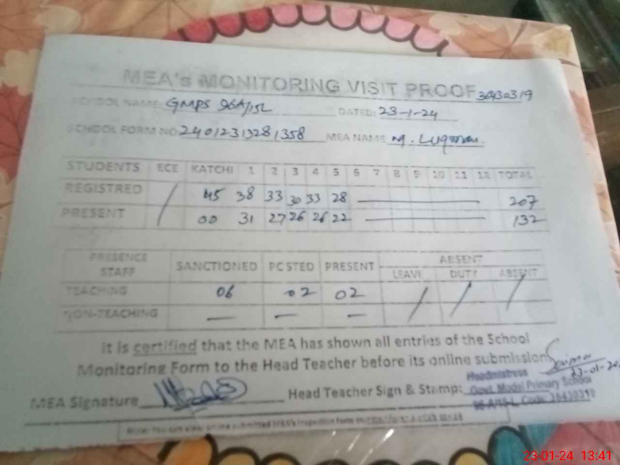 | Certified that this School was Inspected by the Undersigned MEA/DMO Today and the Information Stated Above is as Per Record. | |||||