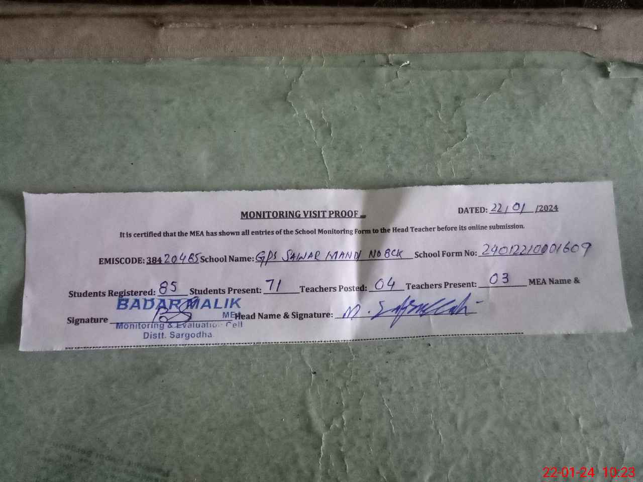 | Attendance Register | Head Teacher | MEA with School | Visit Proof |