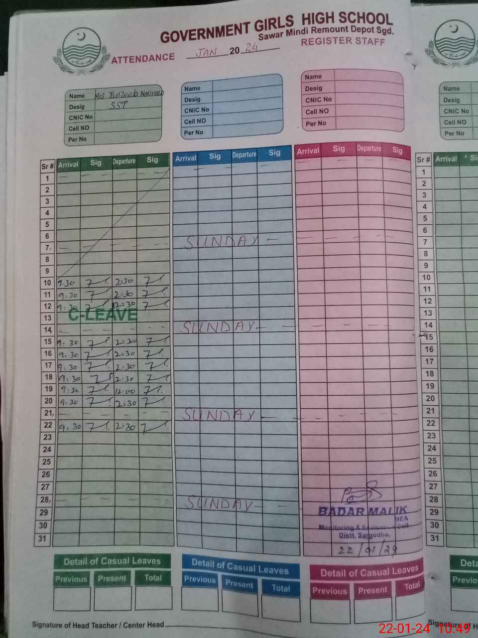 | Remarks (Use Separate Page if Required): Teacher Fareham Afzal is on attachment since Nov 2023 | |||||