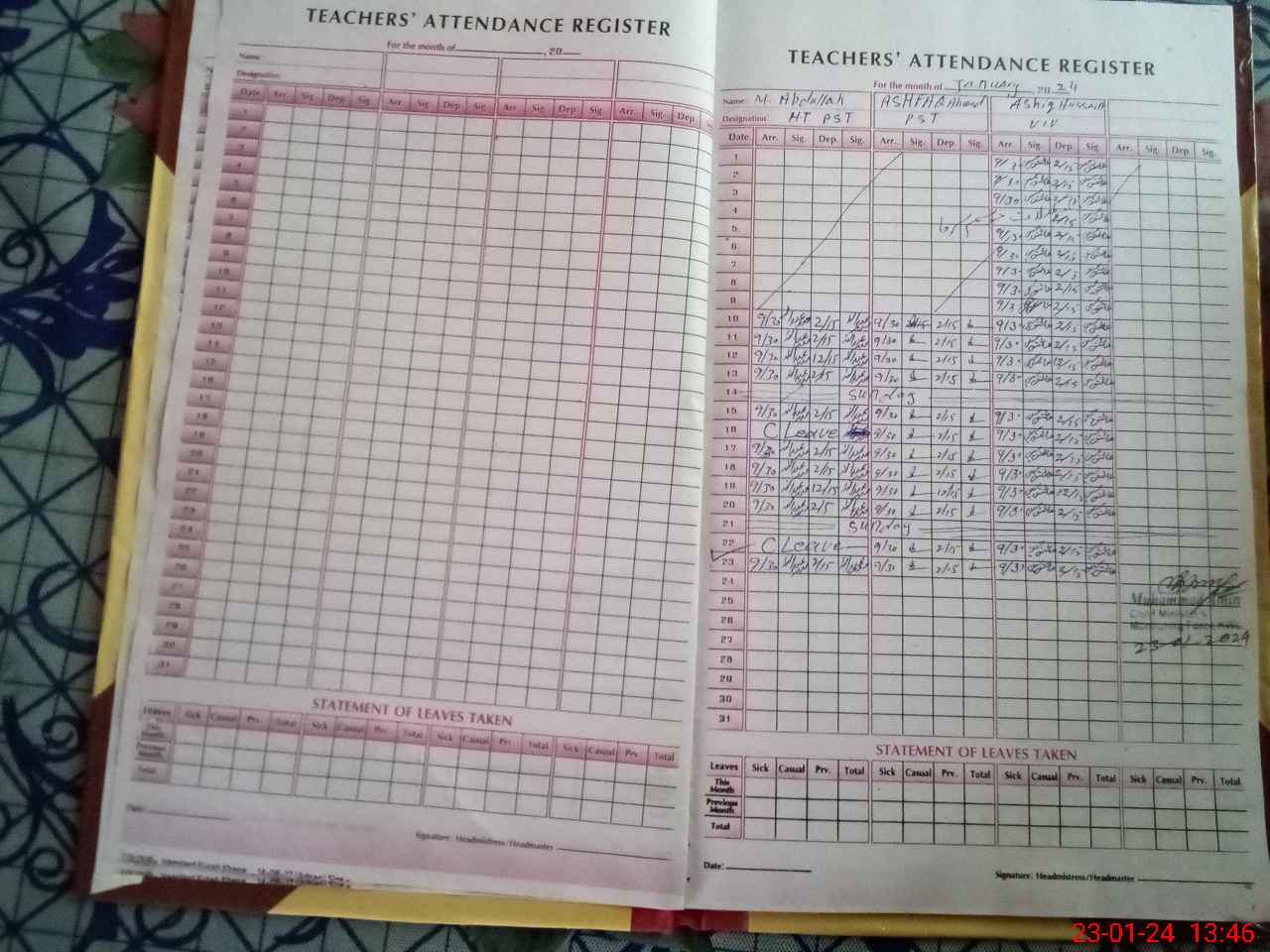 | Total no. of Classrooms: 8 No. of Classrooms Used for Teaching: 6 No. of Classrooms Storing Old Furniture, FTBs, etc: 0Comments if Any: NSB record register not updated for the month of December 2023 |