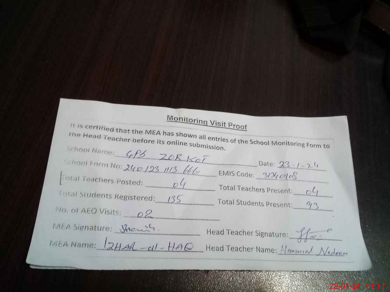 | Attendance Register | Head Teacher | MEA with School | Visit Proof |