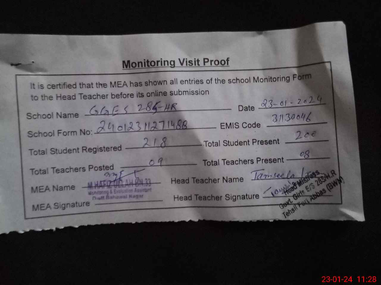 | Attendance Register | Head Teacher | MEA with School | Visit Proof |