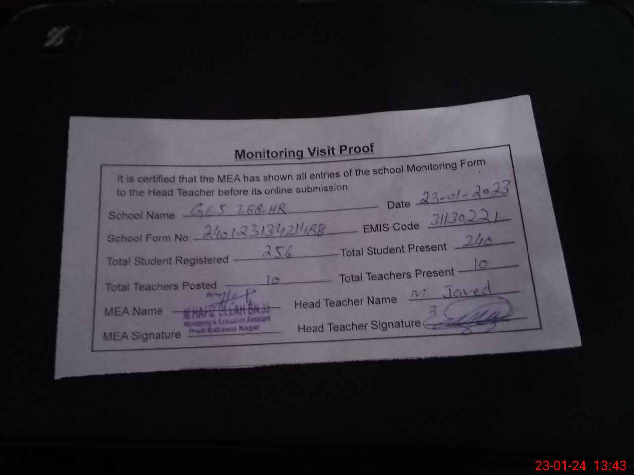 | Attendance Register | Head Teacher | MEA with School | Visit Proof |