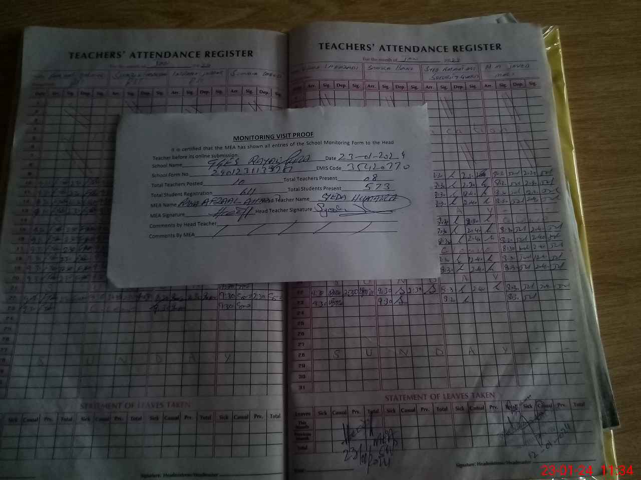 | Attendance Register | Head Teacher | MEA with School | Visit Proof |