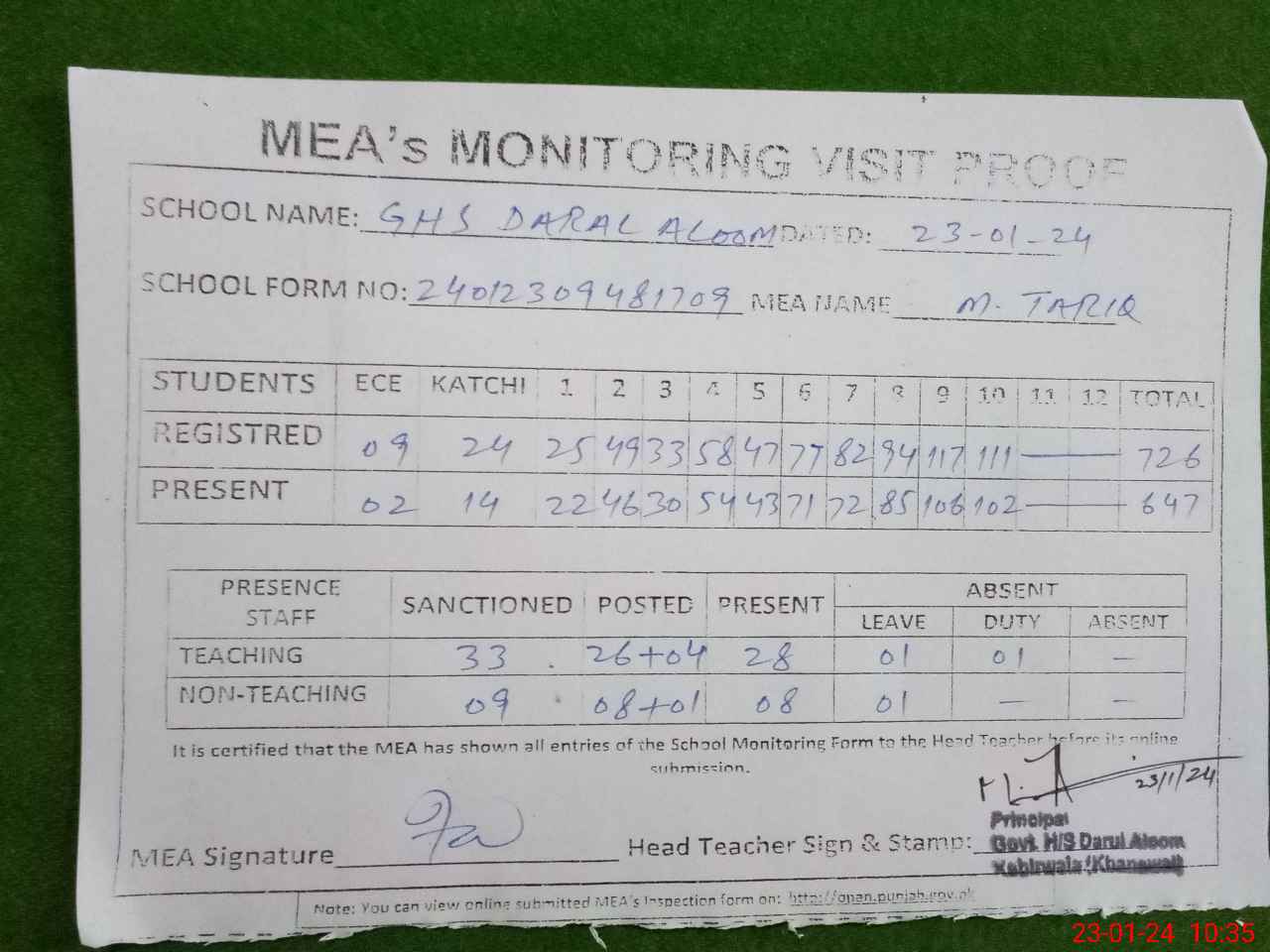 | Attendance Register | Head Teacher | MEA with School | Visit Proof |