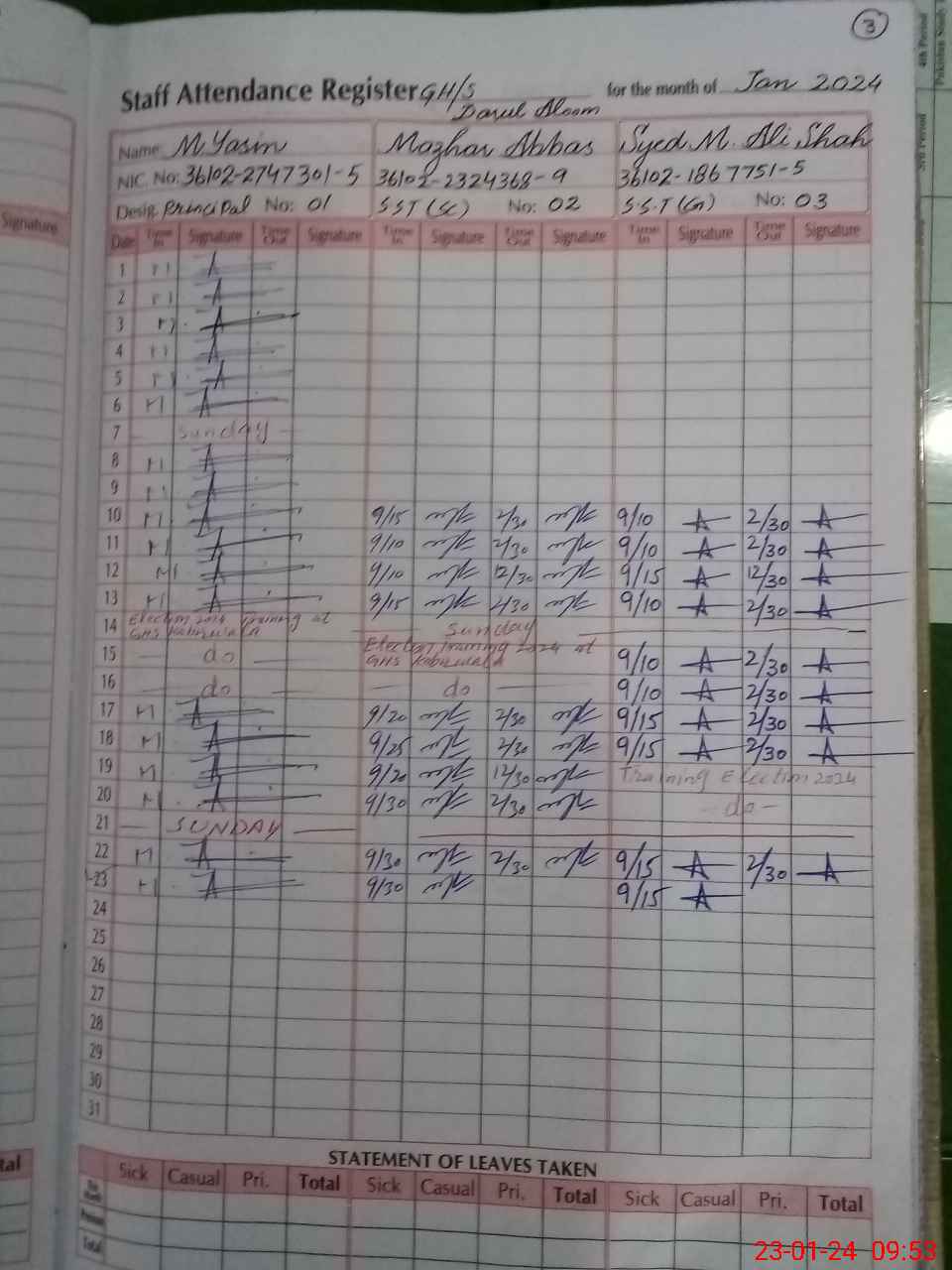 | CNIC | Full Name | Designation | R/C | Absence During Last Calender Month |