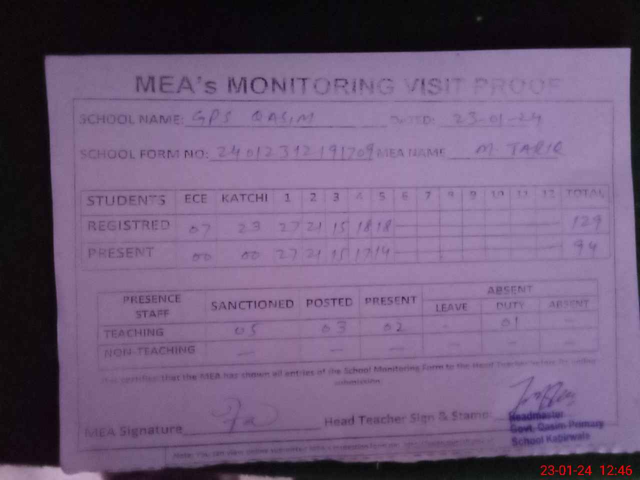 | Attendance Register | Head Teacher | MEA with School | Visit Proof |