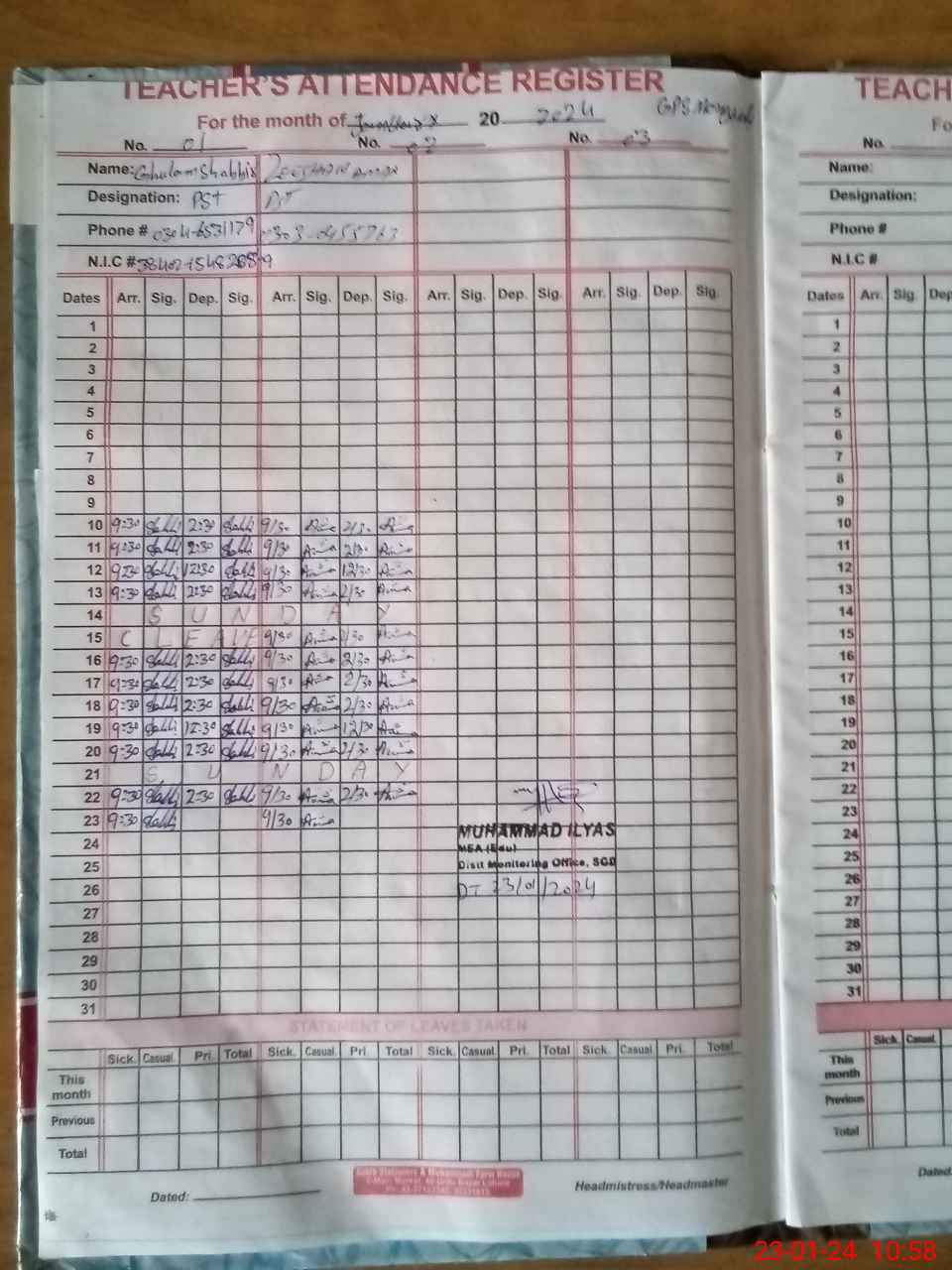 | CNIC | Full Name | Designation | R/C | Absence During Last Calender Month |