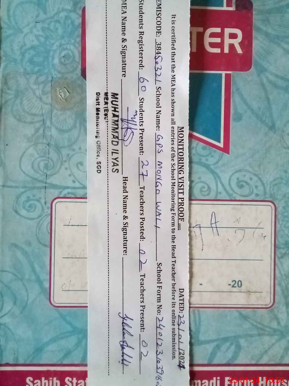 | Attendance Register | Head Teacher | MEA with School | Visit Proof |