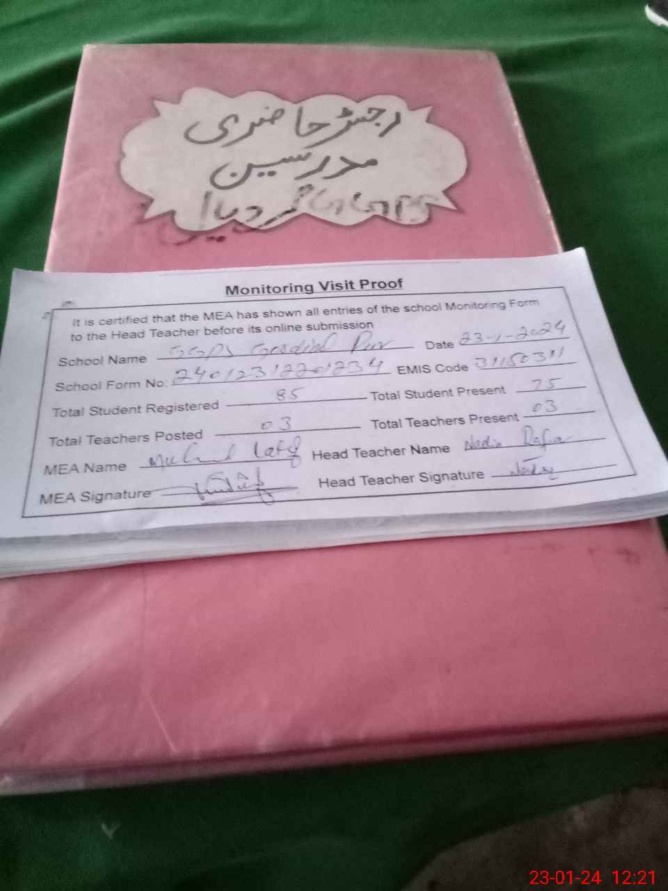 | Attendance Register | Head Teacher | MEA with School | Visit Proof |