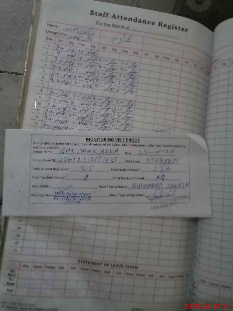 | Attendance Register | Head Teacher | MEA with School | Visit Proof |