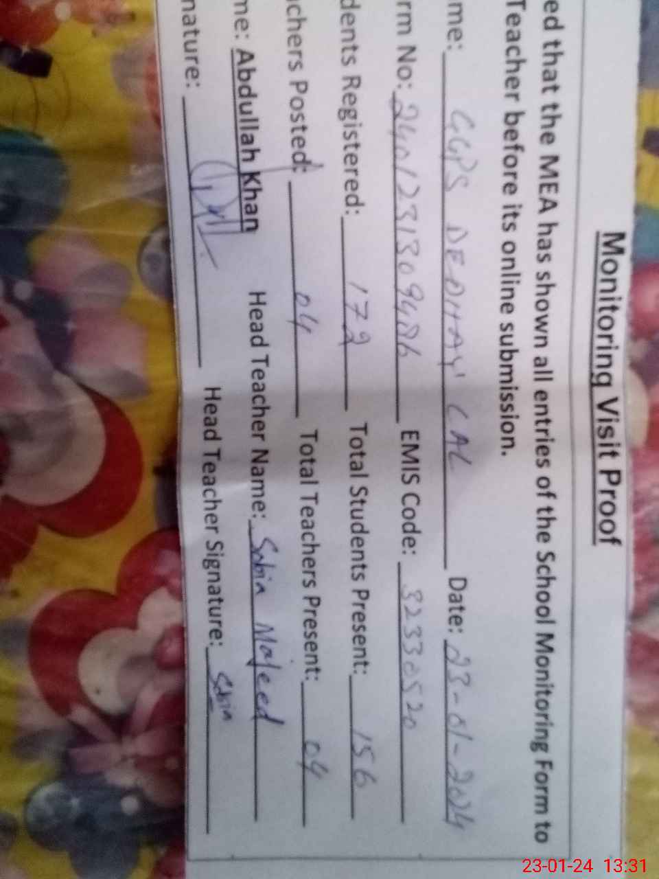 | Attendance Register | Head Teacher | MEA with School | Visit Proof |