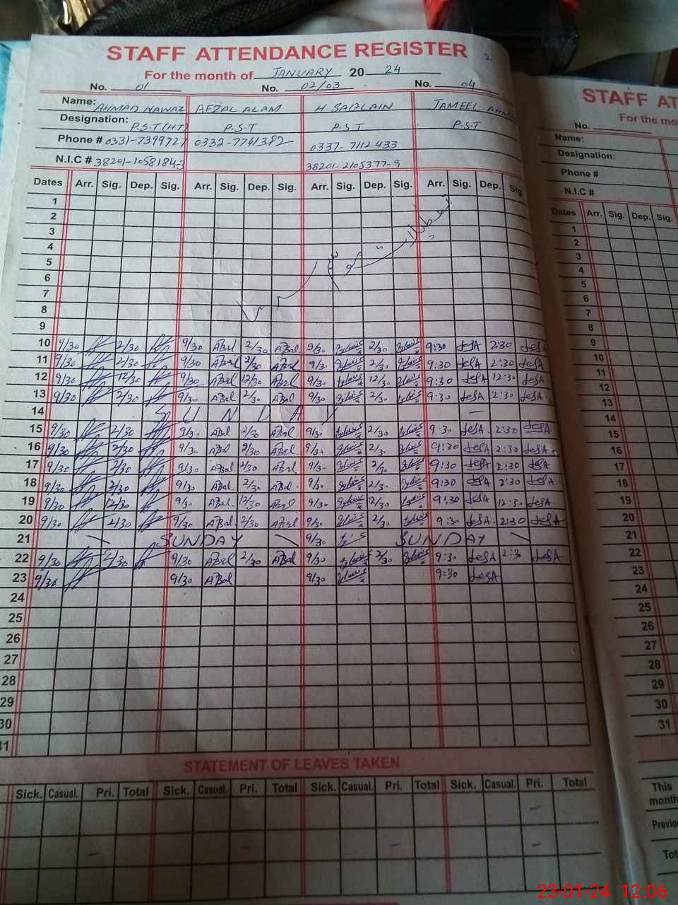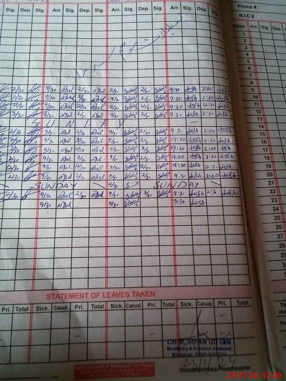 | CNIC | Full Name | Designation | R/C | Absence During Last Calender Month |