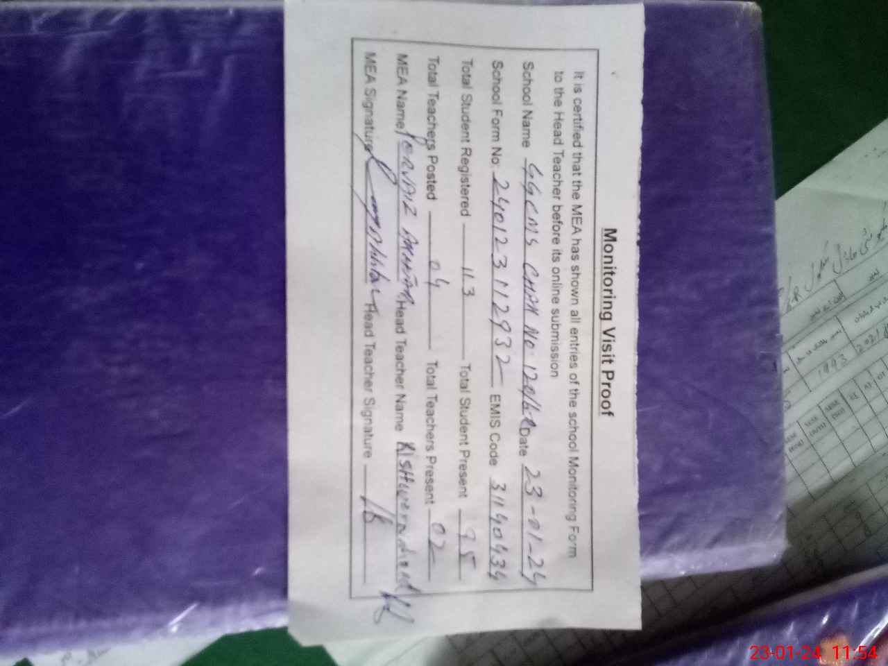 | Attendance Register | Head Teacher | MEA with School | Visit Proof |