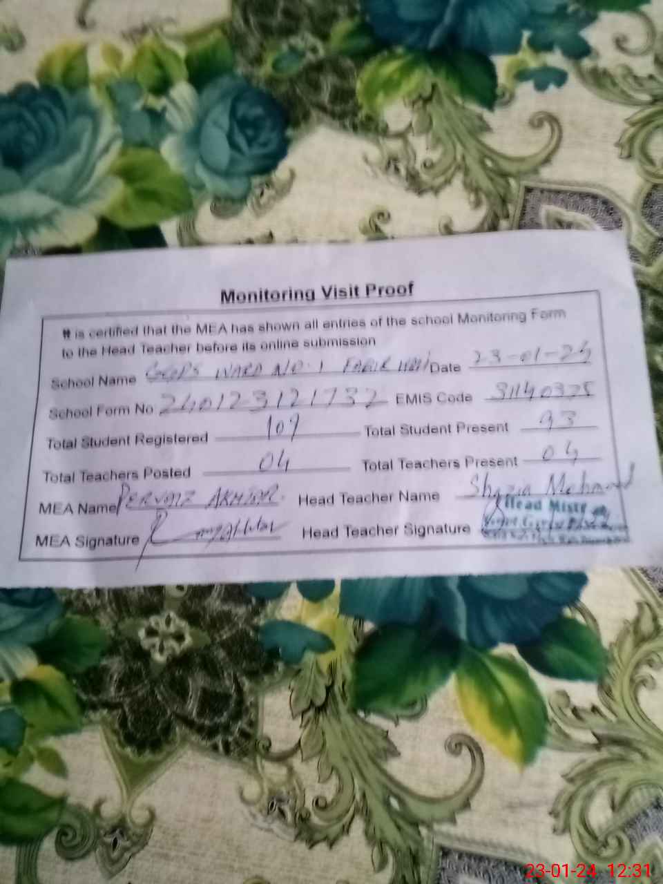 | Attendance Register | Head Teacher | MEA with School | Visit Proof |