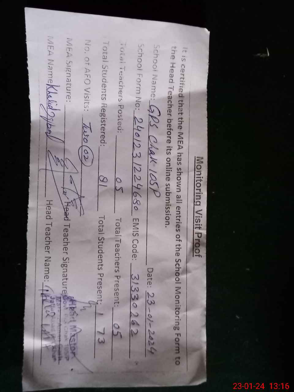 | Attendance Register | Head Teacher | MEA with School | Visit Proof |