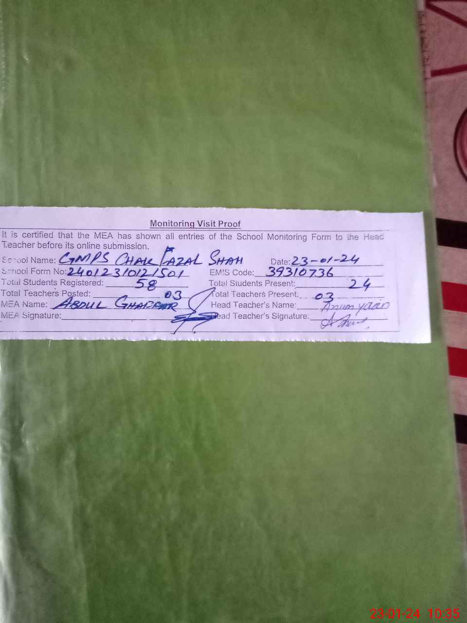| Attendance Register | Head Teacher | MEA with School | Visit Proof |