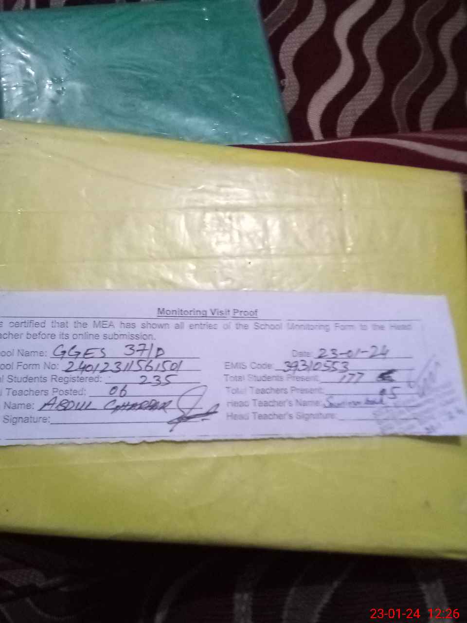 | Attendance Register | Head Teacher | MEA with School | Visit Proof |