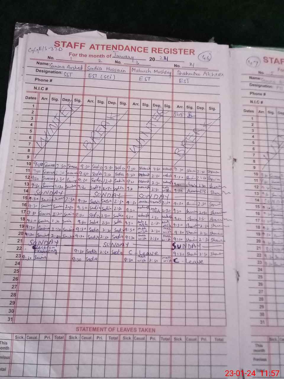 | CNIC | Full Name | Designation | R/C | Absence During Last Calender Month |
