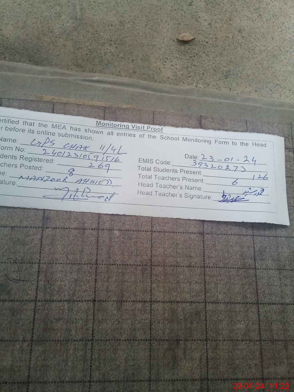 | Attendance Register | Head Teacher | MEA with School | Visit Proof |