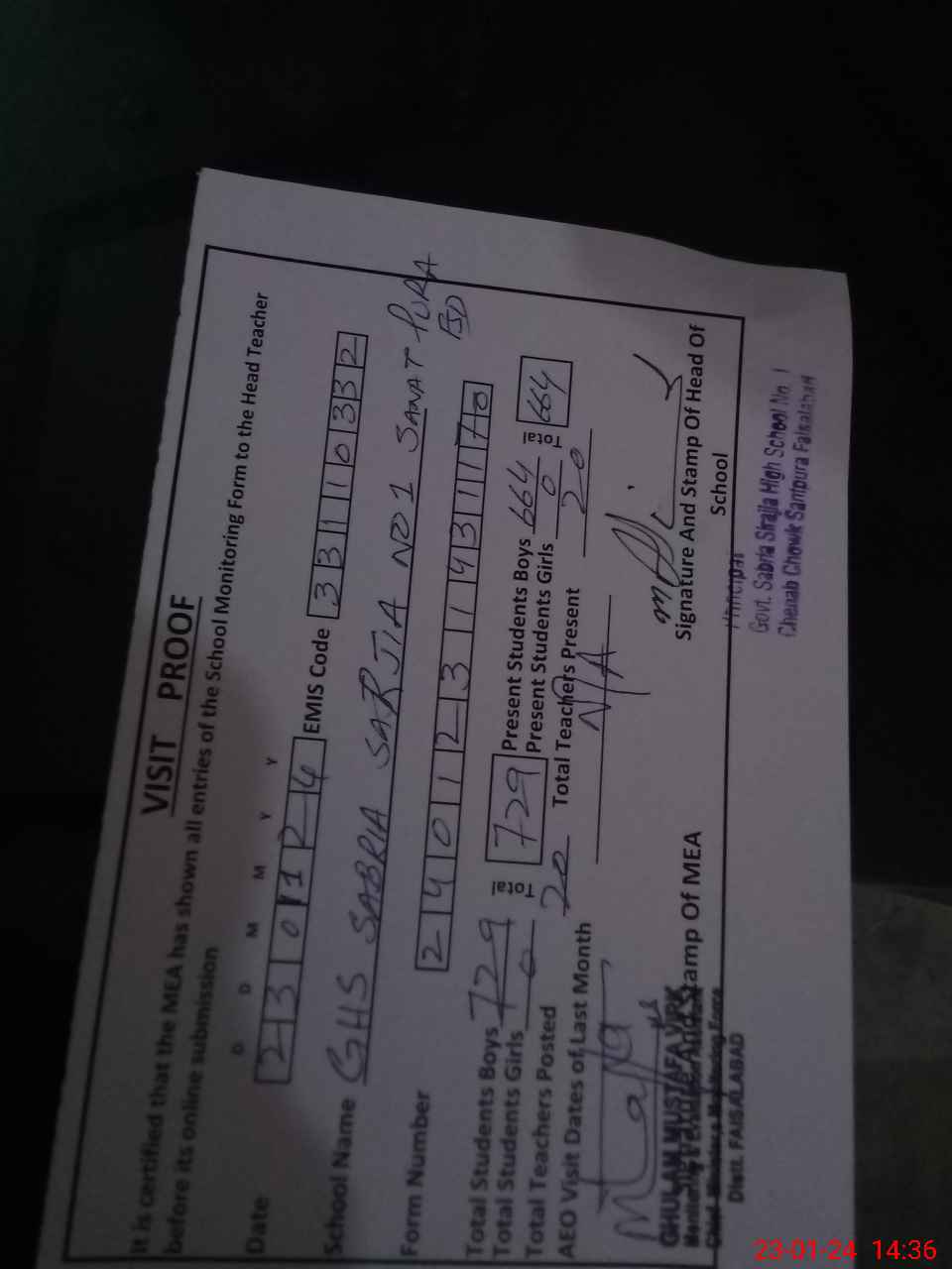 | Attendance Register | Head Teacher | MEA with School | Visit Proof |