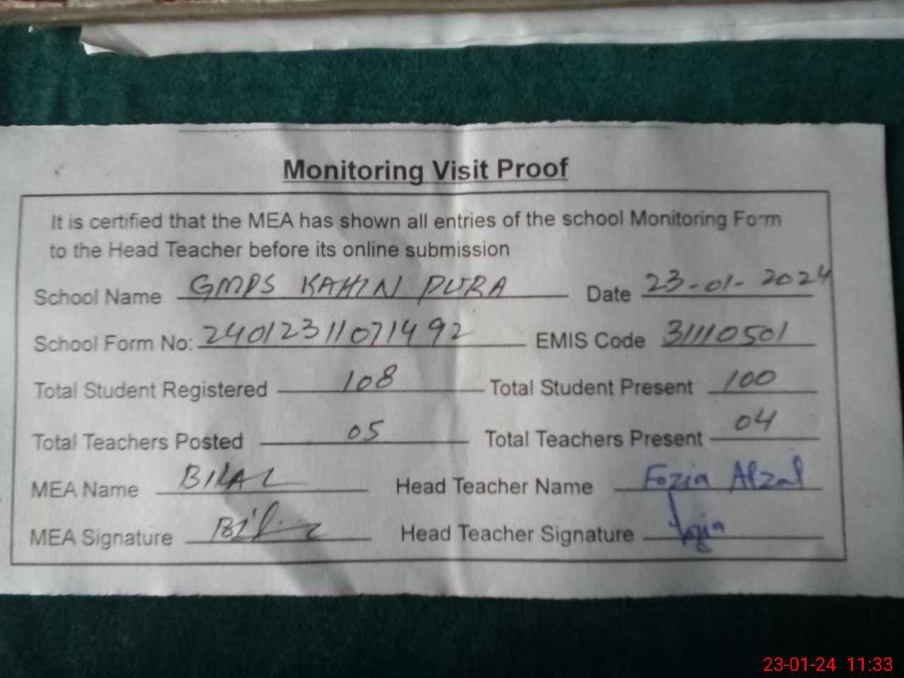 | Attendance Register | Head Teacher | MEA with School | Visit Proof |