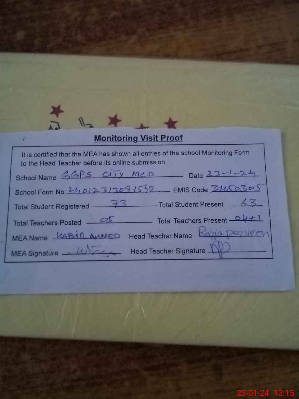 | Attendance Register | Head Teacher | MEA with School | Visit Proof |