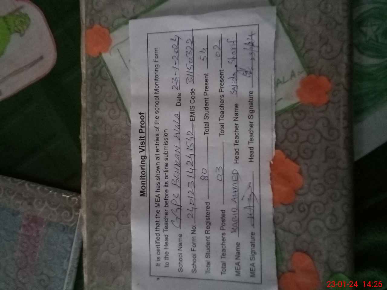 | Attendance Register | Head Teacher | MEA with School | Visit Proof |