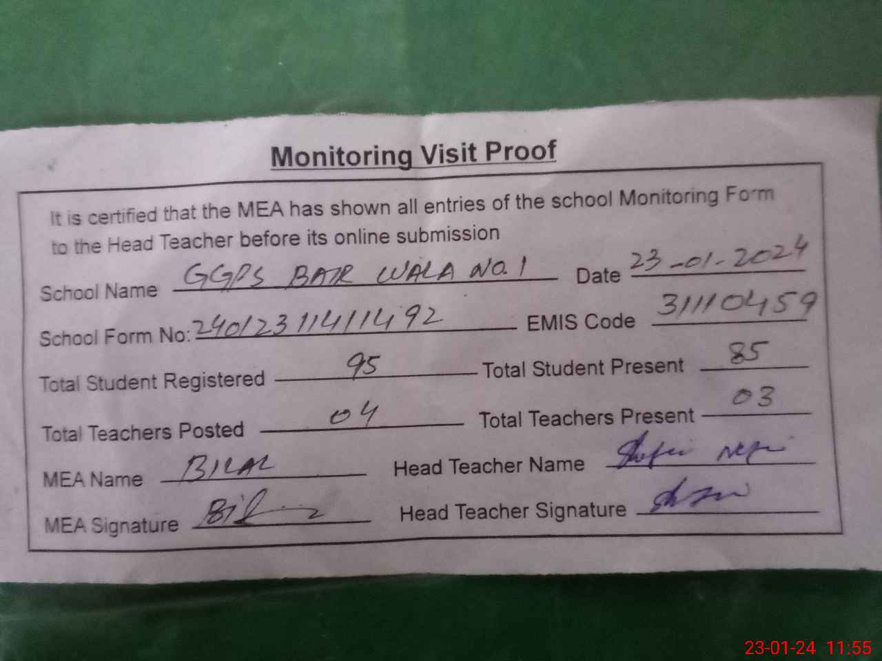 | Attendance Register | Head Teacher | MEA with School | Visit Proof |