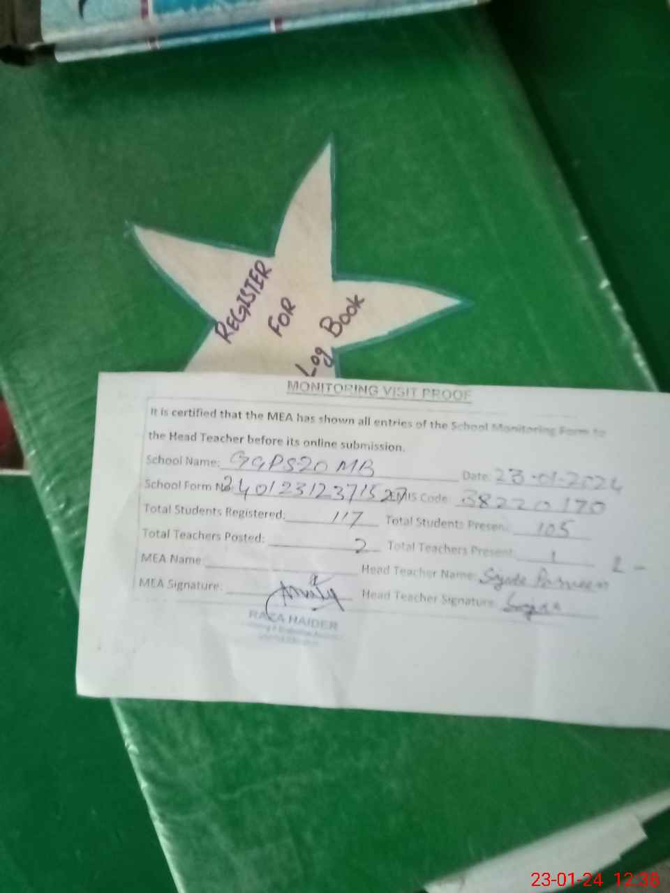 | Attendance Register | Head Teacher | MEA with School | Visit Proof |