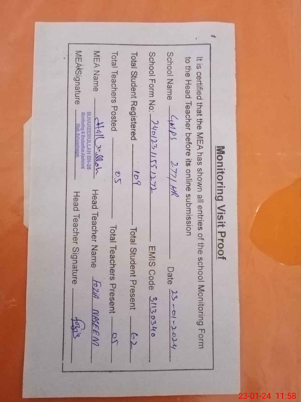 | Attendance Register | Head Teacher | MEA with School | Visit Proof |