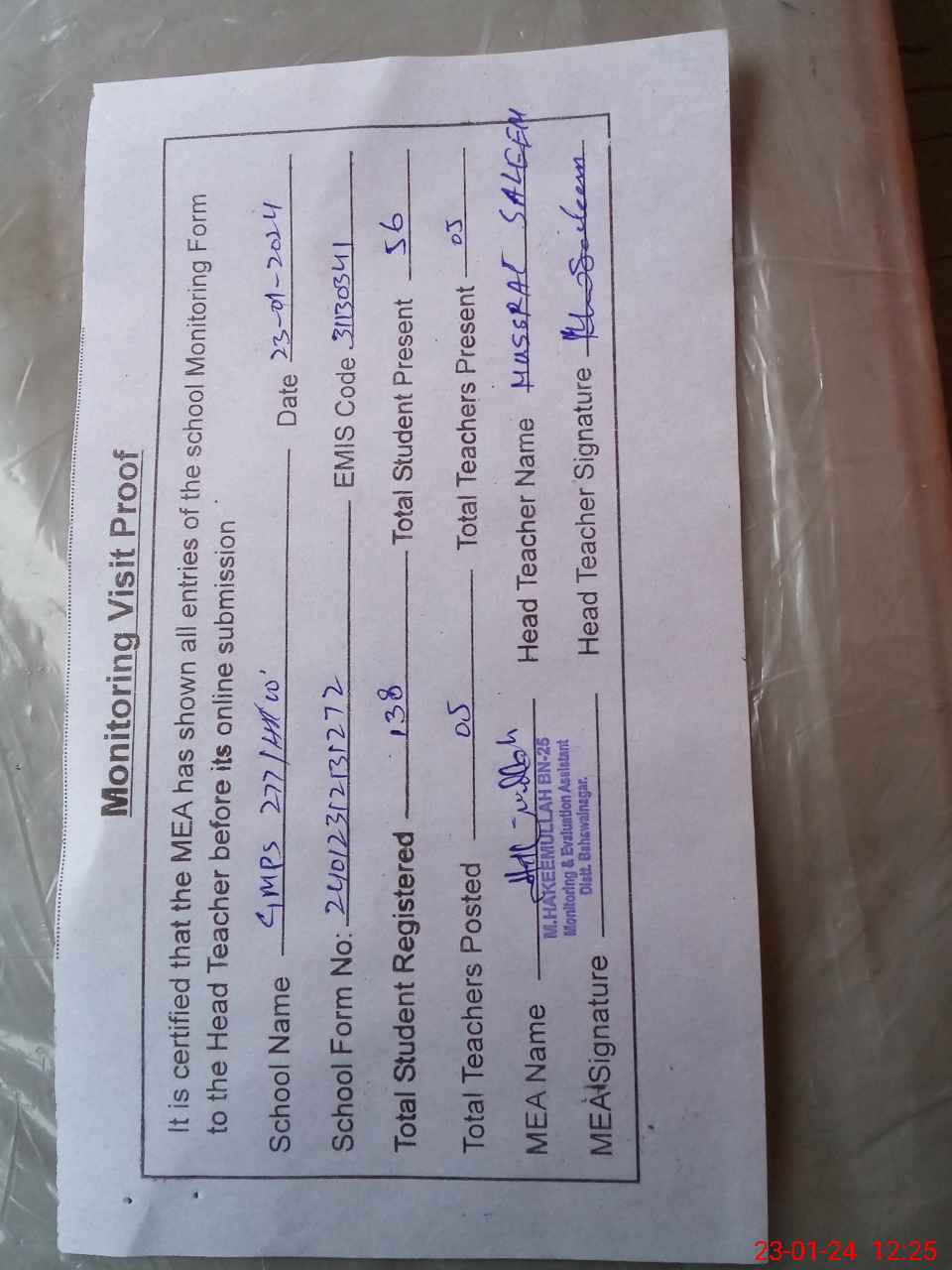 | Attendance Register | Head Teacher | MEA with School | Visit Proof |