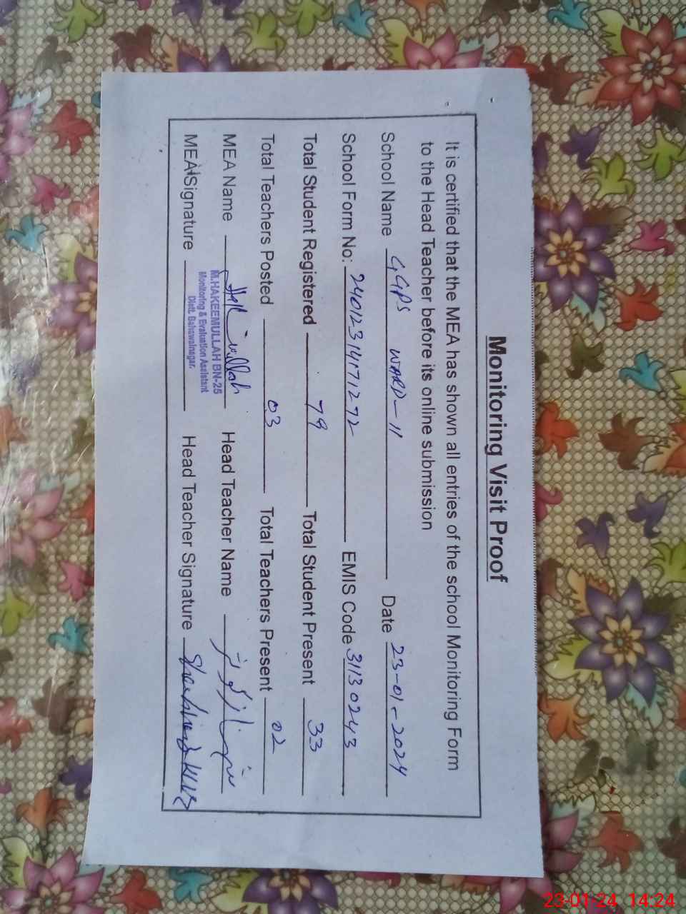 | Attendance Register | Head Teacher | MEA with School | Visit Proof |