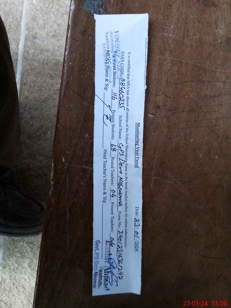 | Attendance Register | Head Teacher | MEA with School | Visit Proof |