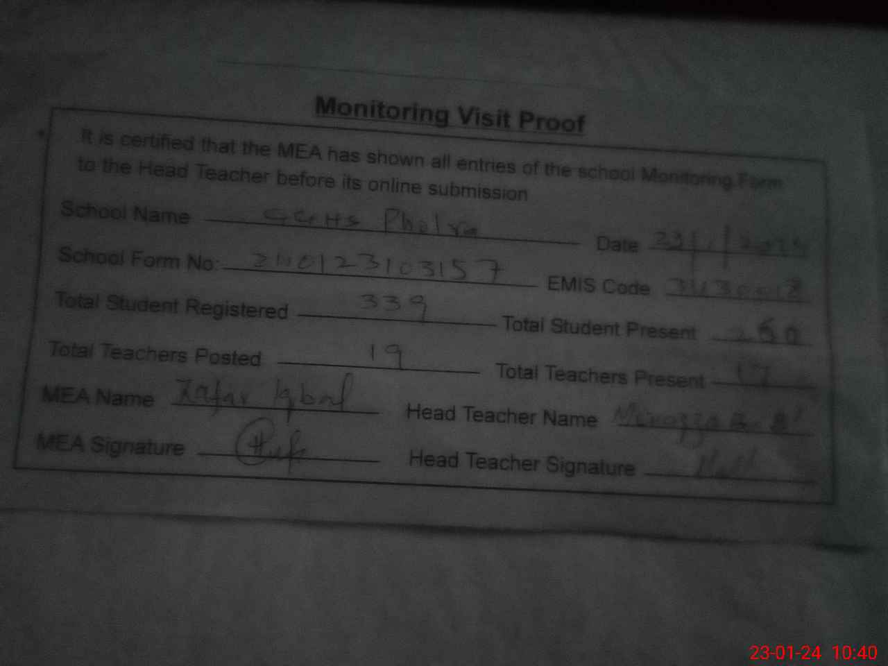 | Attendance Register | Head Teacher | MEA with School | Visit Proof |