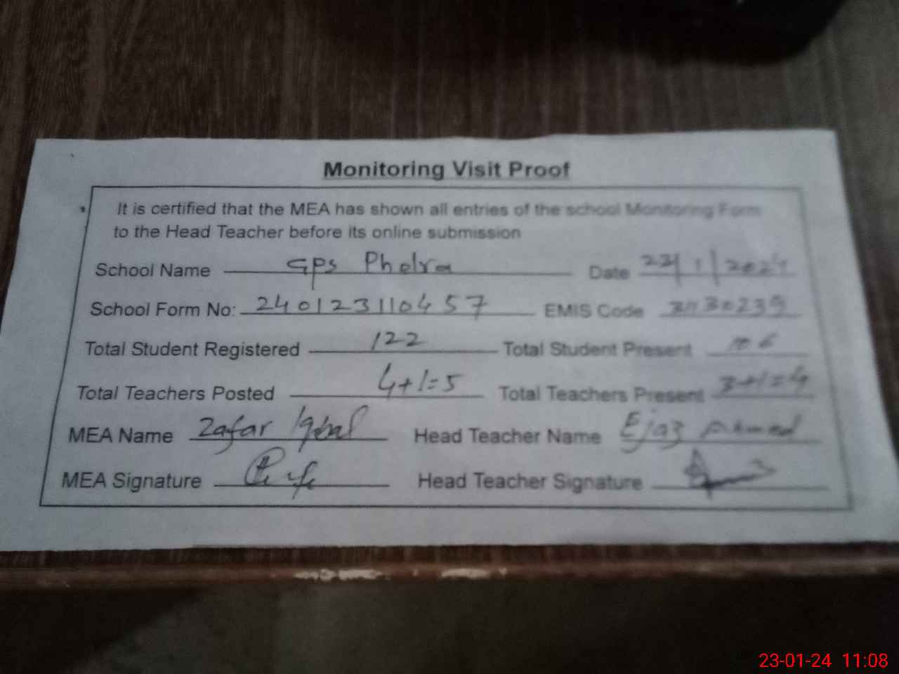 | Attendance Register | Head Teacher | MEA with School | Visit Proof |