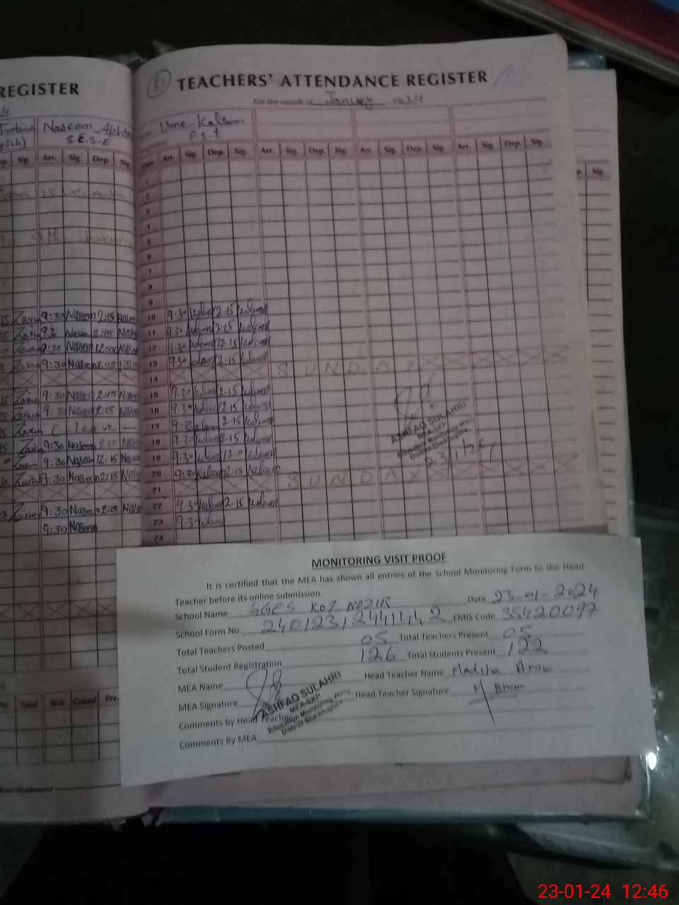 | Attendance Register | Head Teacher | MEA with School | Visit Proof |
