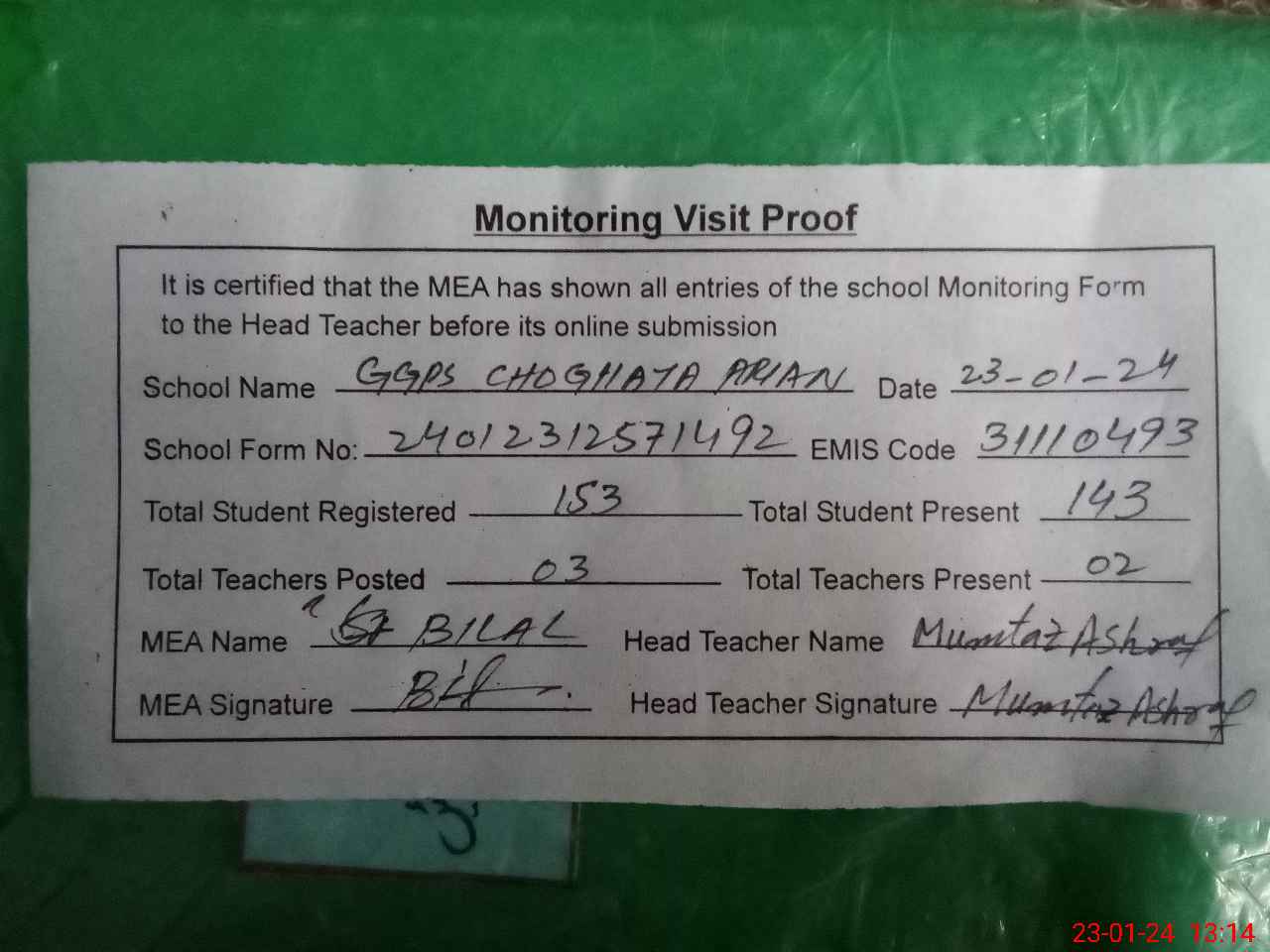 | Attendance Register | Head Teacher | MEA with School | Visit Proof |