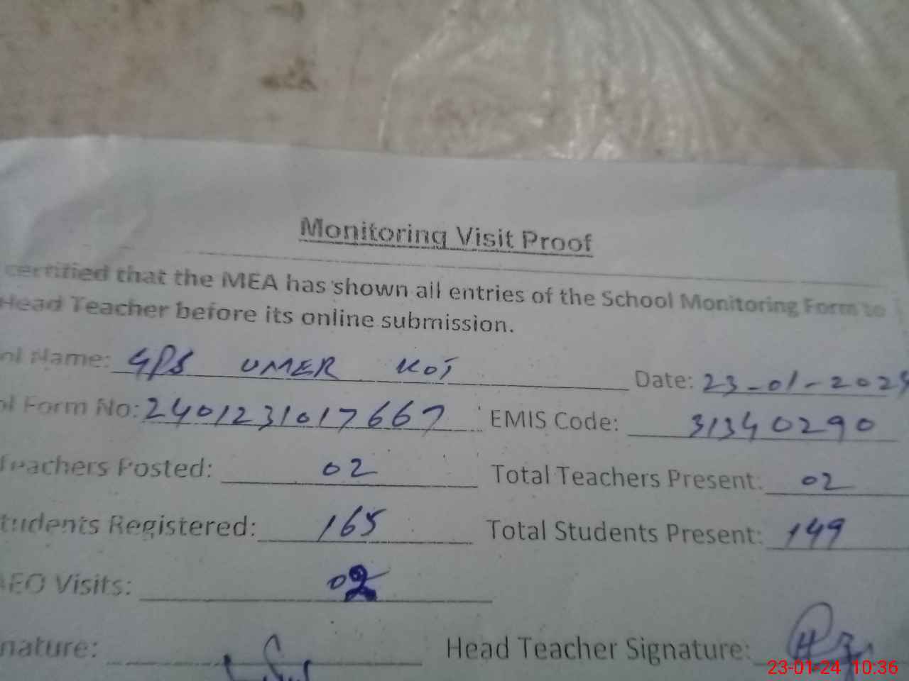 | Attendance Register | Head Teacher | MEA with School | Visit Proof |