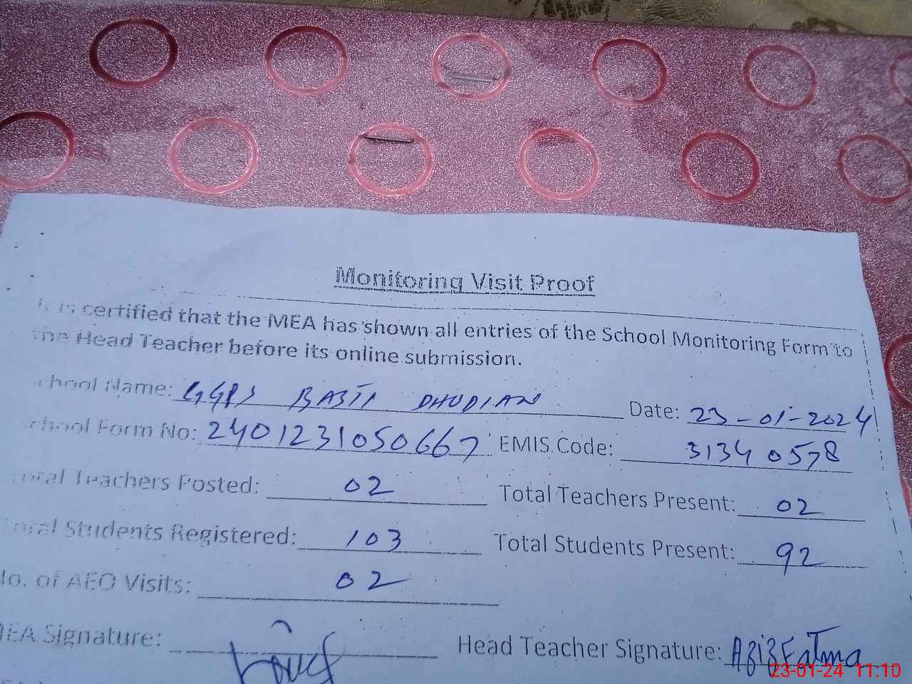 | Attendance Register | Head Teacher | MEA with School | Visit Proof |