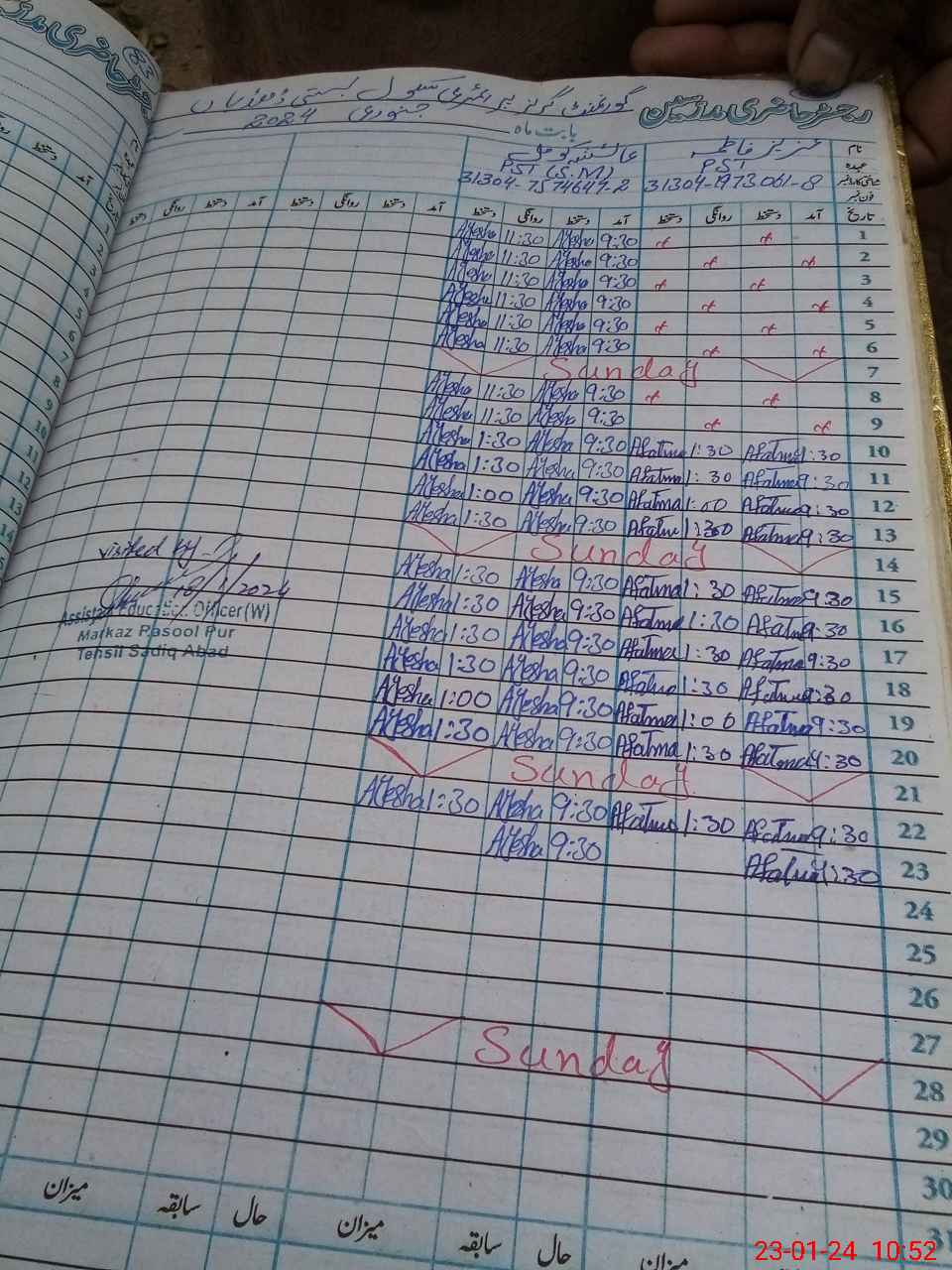 | Name: AZ**** FA**** Designation: (School Headmaster's/Headmistress's) PST Phone/Cell Number: 03**** |