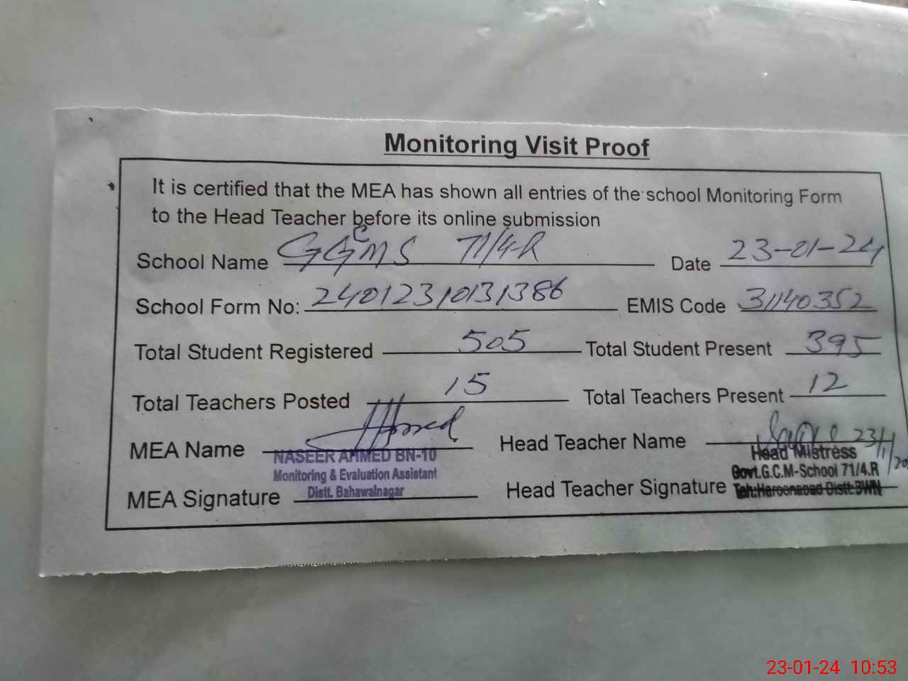 | Attendance Register | Head Teacher | MEA with School | Visit Proof |