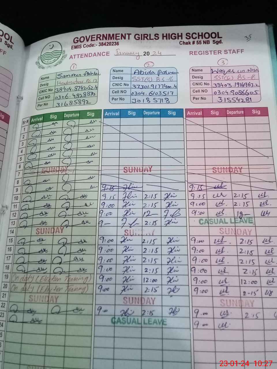 | CNIC | Full Name | Designation | R/C | Absence During Last Calender Month |