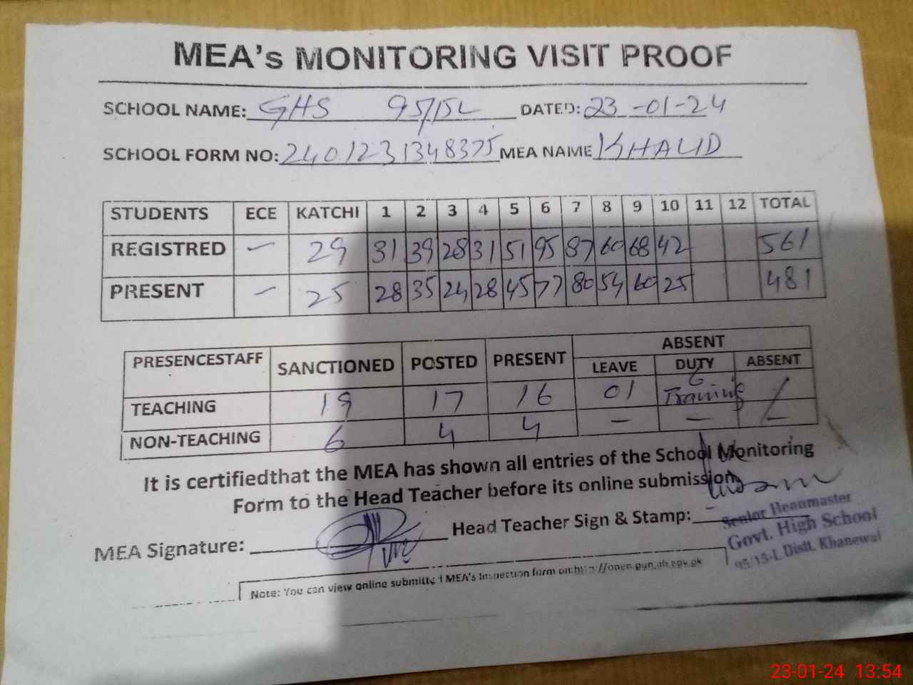 | Attendance Register | Head Teacher | MEA with School | Visit Proof |