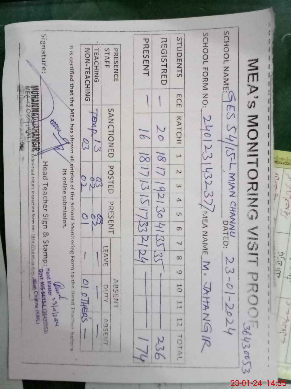 | Attendance Register | Head Teacher | MEA with School | Visit Proof |
