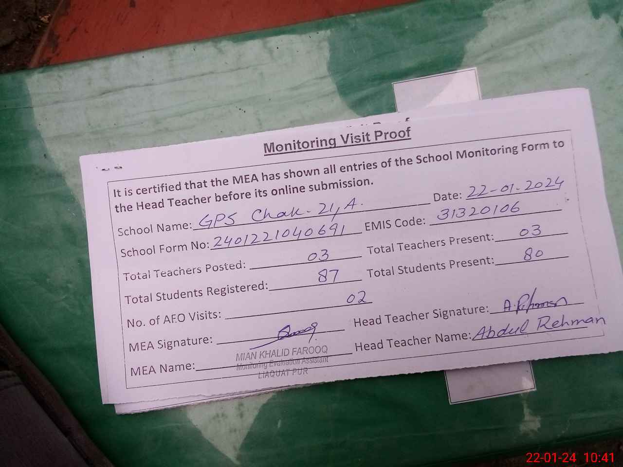| Attendance Register | Head Teacher | MEA with School | Visit Proof |