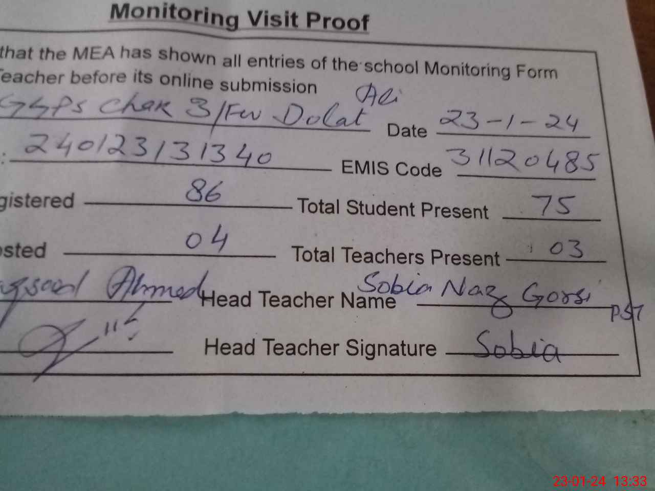 | Attendance Register | Head Teacher | MEA with School | Visit Proof |